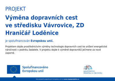 Název projektu: Výměna dopravních cest ve středisku Vávrovice, ZD Hraničář Loděnice Číslo projektu: CZ.01.04.01/01/22_006/0001194 Popis projektu: Projekt „Výměna dopravních cest ve středisku Vávrovice, ZD Hraničář…
